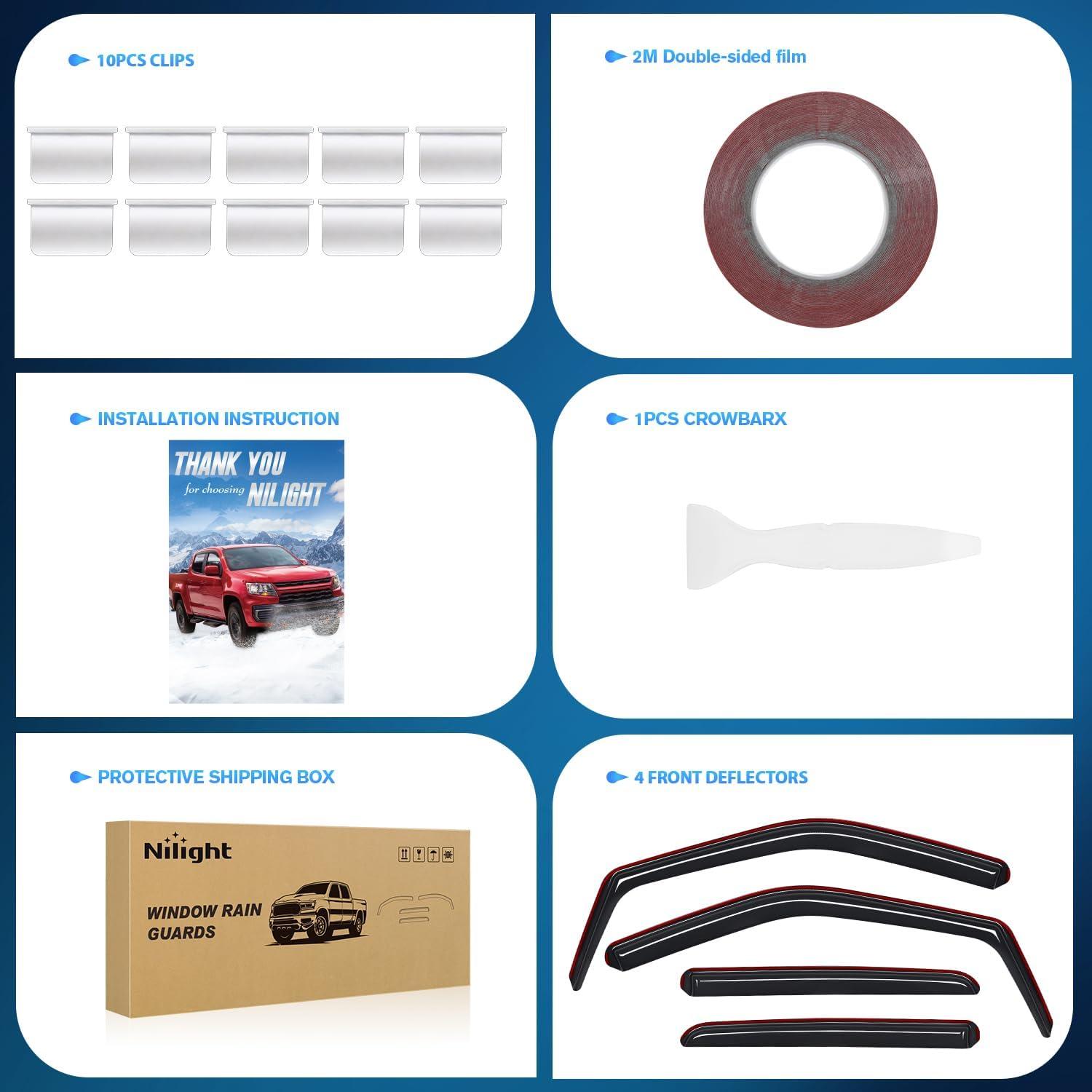 PACKAGE INCLUDED: 4PCS In-Channel Window Visors, 12 PCS clips, 1 crowbar tool, automotive-grade double-sided tape, and detailed installation instructions