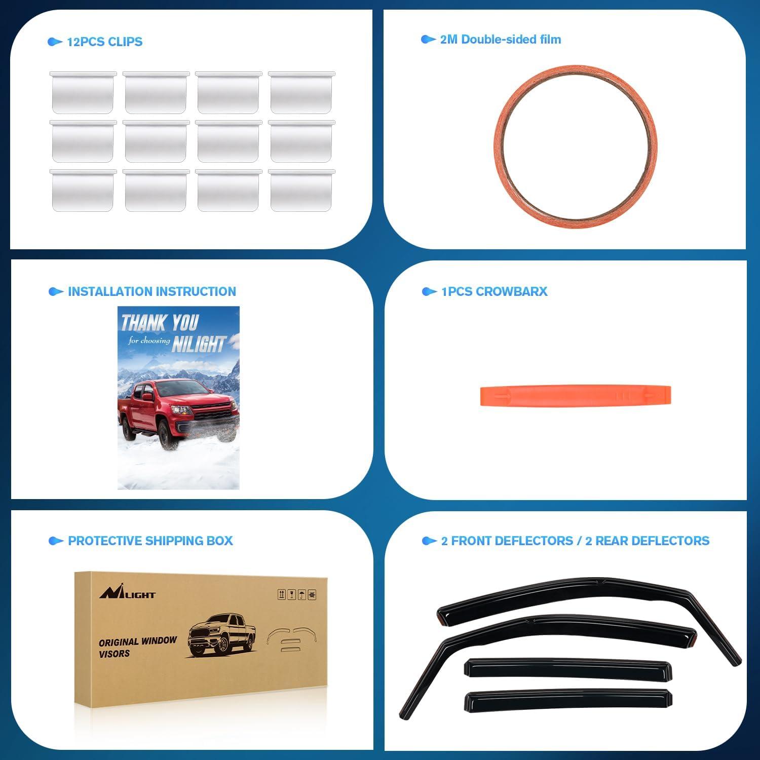 PACKAGE INCLUDED:4 PCS Rain Guards,12pcs clips,Crowbar 1pcs,78inch double-sided tape and installation instruction