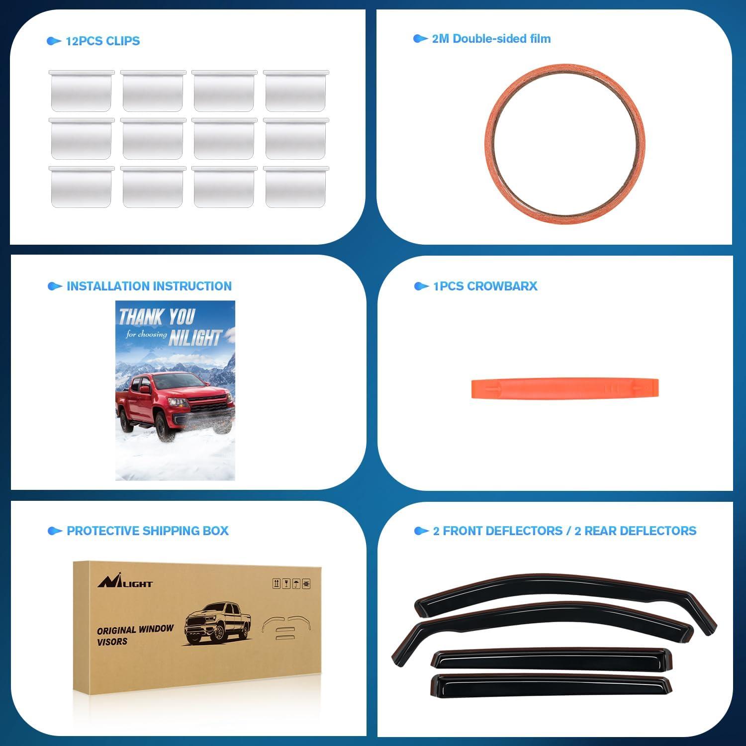 Advantage:Nilight window deflectors are great for all weather conditions,help improve ventilation inside and outside your car to reduce mirror and window fogging while increasing air circulation。With our side window deflectors, it deflects the rain and noise away from your windows to make your driving more enjoyable