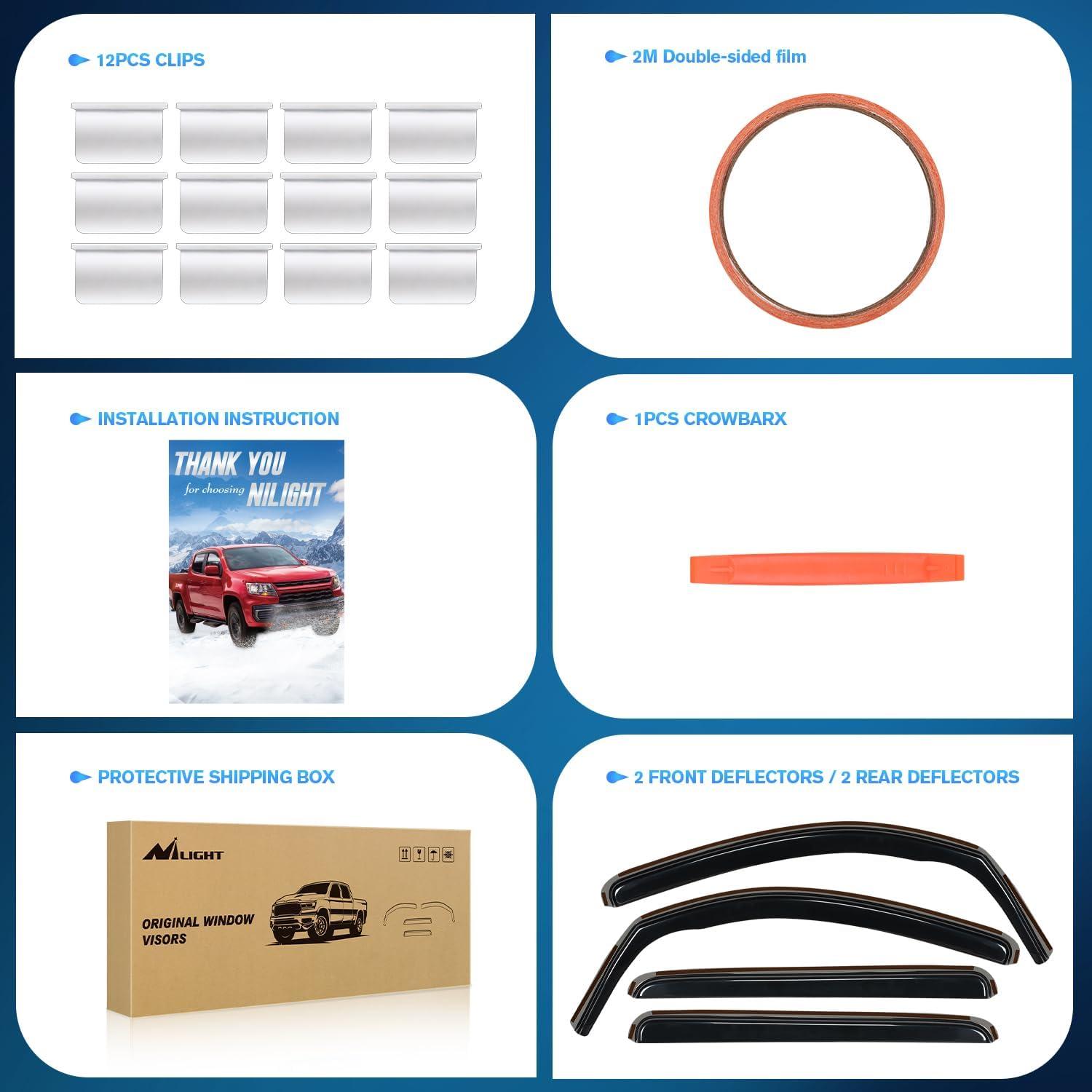 Advantage:Nilight window deflectors are great for all weather conditions,help improve ventilation inside and outside your car to reduce mirror and window fogging while increasing air circulation。With our side window deflectors, it deflects the rain and noise away from your windows to make your driving more enjoyable