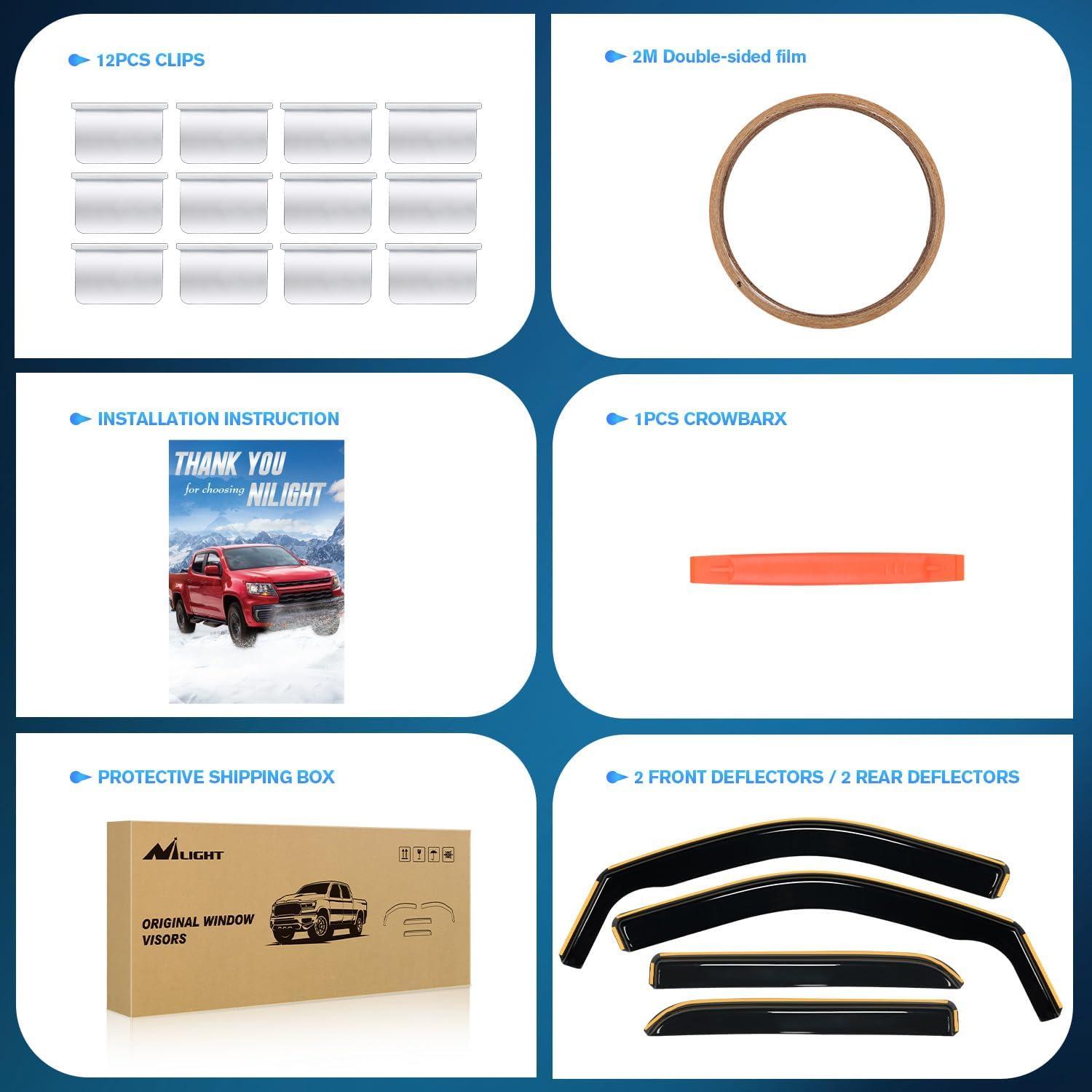 Advantage:Nilight window deflectors are great for all weather conditions,help improve ventilation inside and outside your car to reduce mirror and window fogging while increasing air circulation。With our side window deflectors, it deflects the rain and noise away from your windows to make your driving more enjoyable