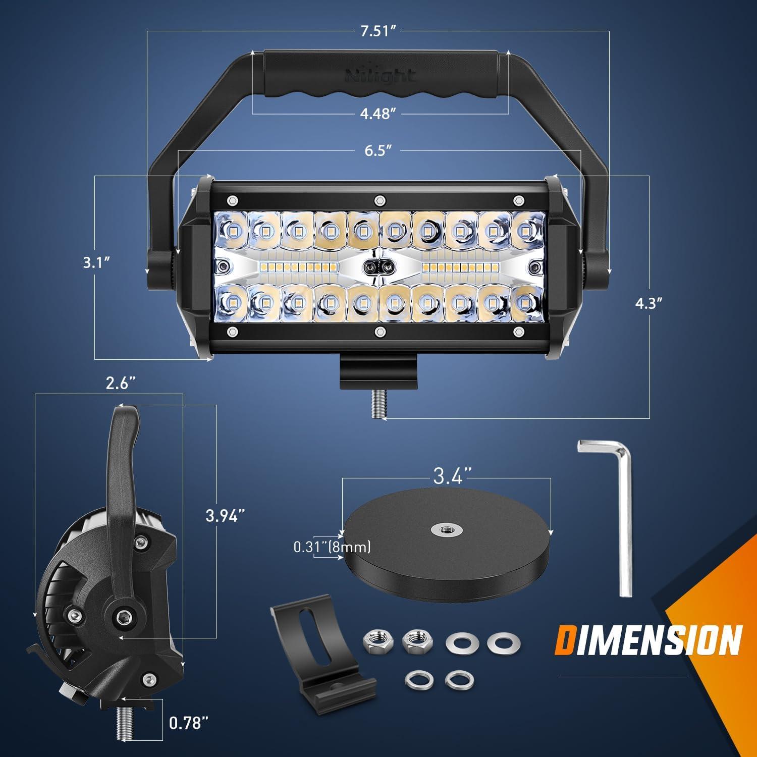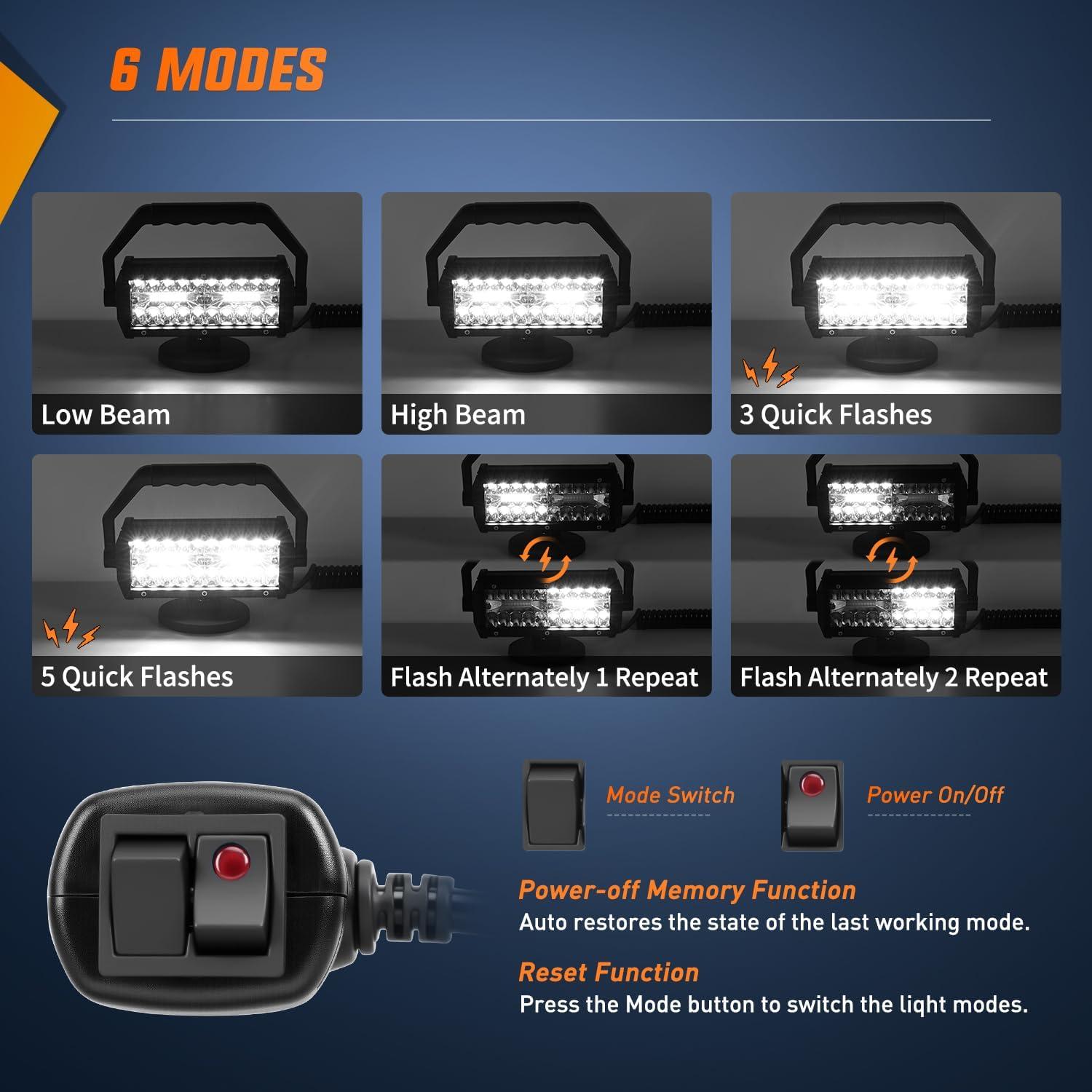 6 Modes Lighting Design: White low brightness, white high brightness, 3 quick flashes, 5 quick flashes, flash alternately 1 repeat, and flash alternately 2 repeat; Can be switched each mode in turn by the MODE button of the light bar wiring harness to meet your various lighting needs