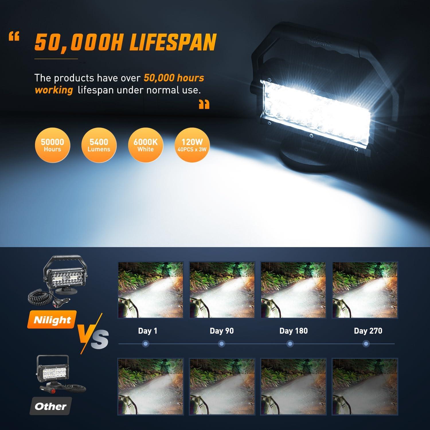 High Performance: IP67 Waterproof rating, die-cast aluminum alloy shell, waterproof, dustproof, rustproof and shockproof perfect performance. Quick cooling alloy heat sinks can effectively extend the lifespan of the driving light to over 50,000 lifespan