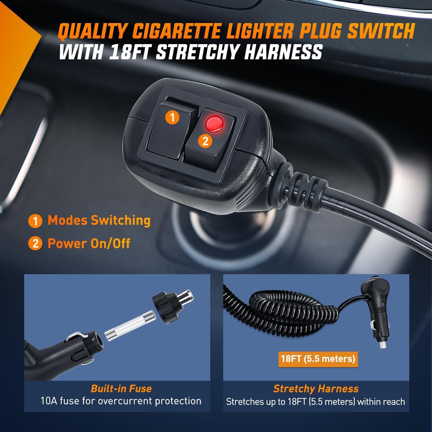 Cigarette Lighter & Elastic Harness: Cigarette lighter design, plug and play, no wiring required, with 18ft long elastic harness and independent ON/OFF switch. Built-in replaceable 10A fuse, very suitable for 12V 24V vehicles with cigarette lighter interface