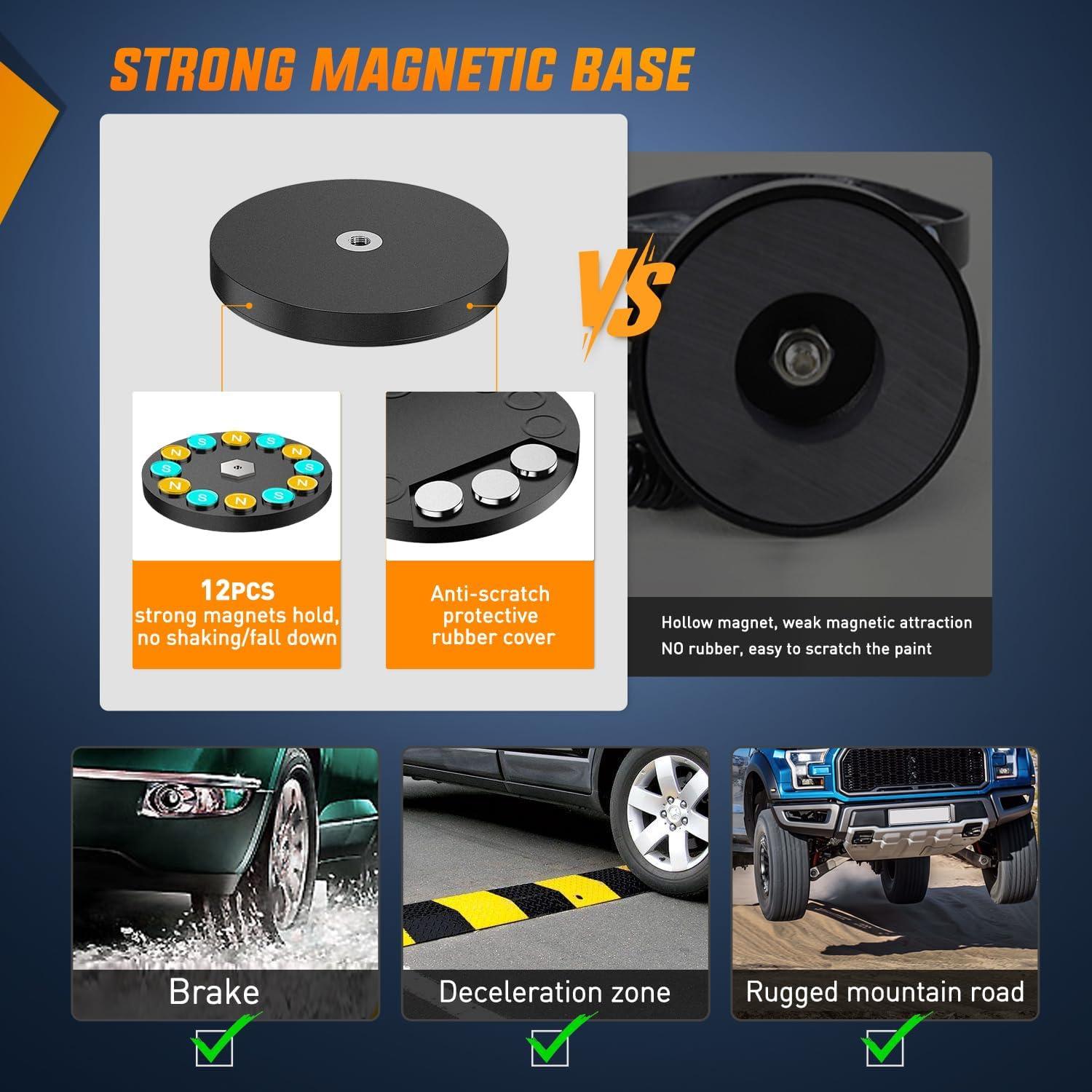 Adjustable & No Drill: The bracket is a 180° adjustable design. The strong magnetic base can be adsorbed on the iron surface of the vehicle without drilling holes. Once matching well with the flat surface, it is strongly held even on emergency braking or driving on a rugged mountain road