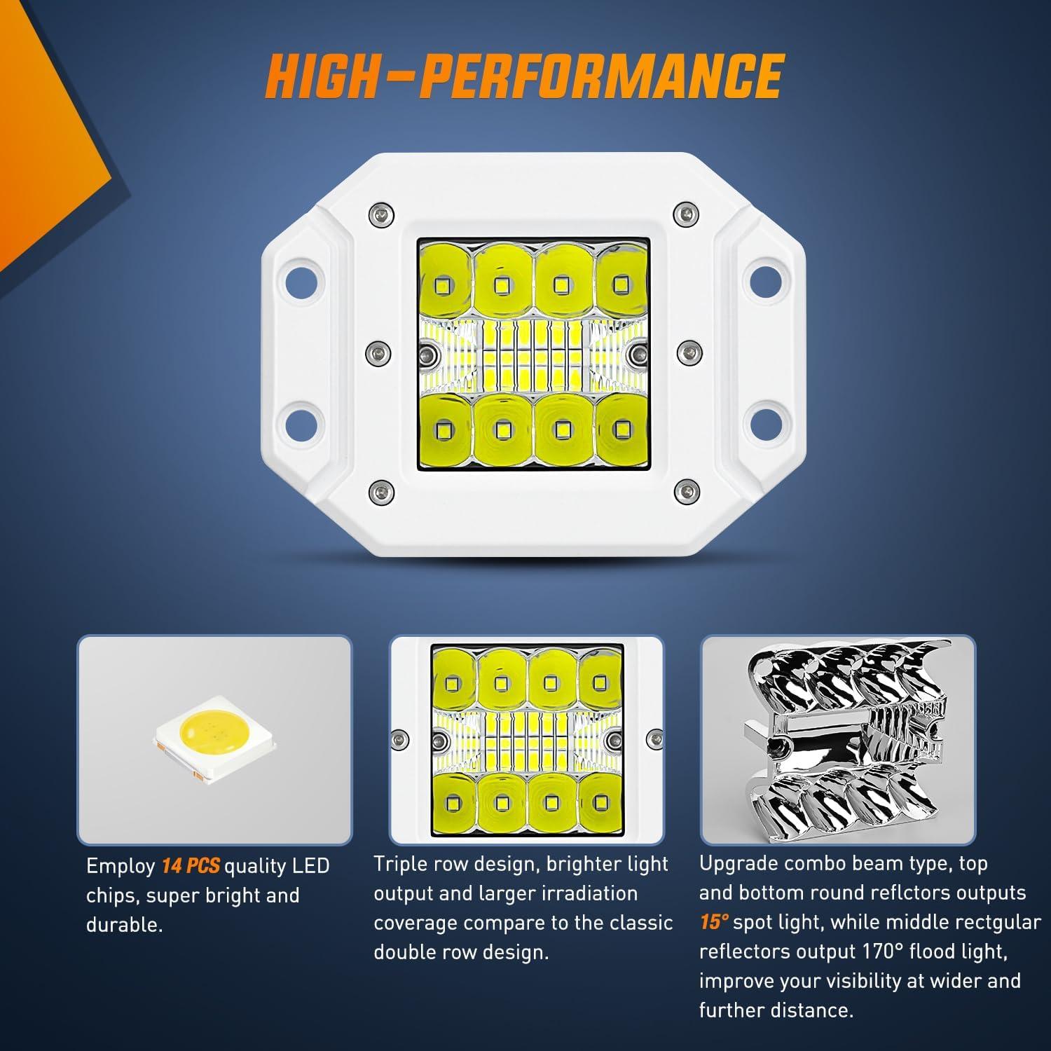 Excellent Brightness: Triple row design, 14LEDs with a combination of flood and spot beam, the flush mount light pods emits a better and perfect 7800LM light to light up the entire road ahead of you, excellent visibility, no more afraid of darkness