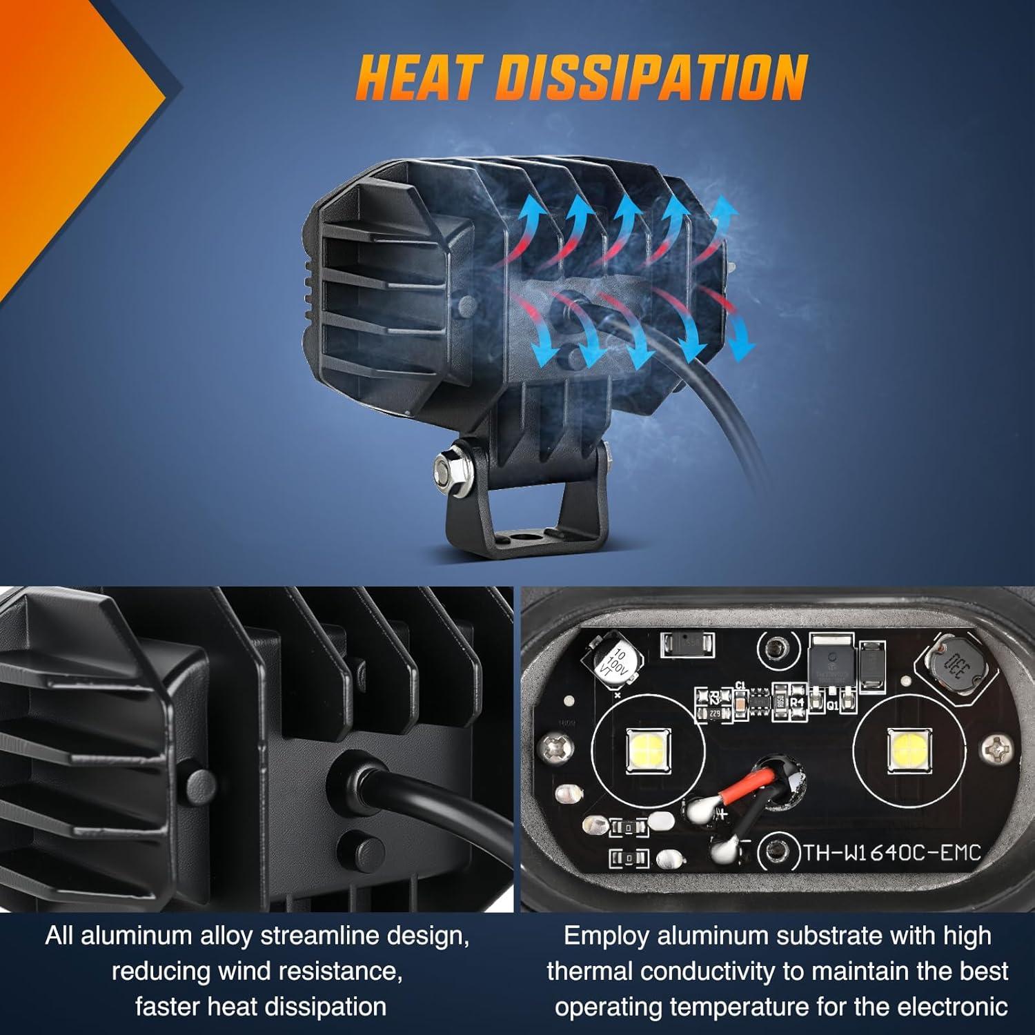 Premium Quality: IP67 Waterproof rating, die-cast aluminum alloy shell, waterproof, dustproof, rustproof and shockproof perfect performance. Quick cooling alloy heat sinks can effectively extend the lifespan of the driving light to over 50,000 lifespan