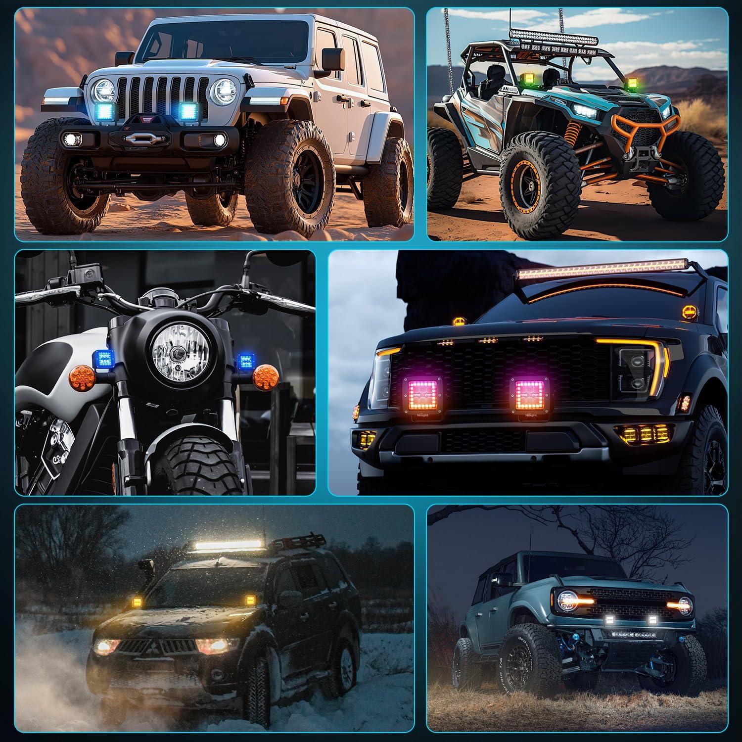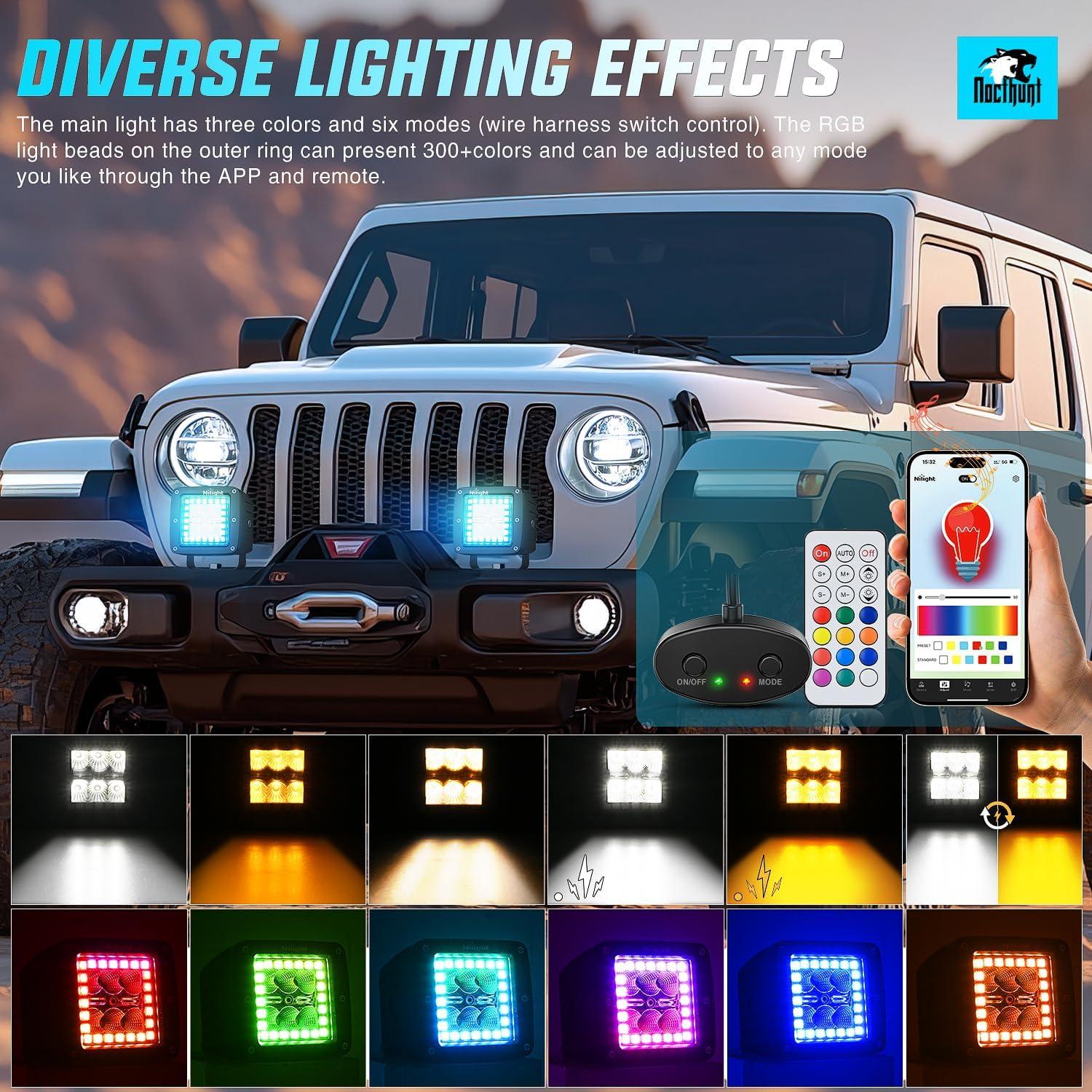 Dual LED Design: Features 6pcs high-power dual-color main LEDs for bright, stable illumination, meeting both day and night driving needs. Combined with the floodlight cup, the light range expands. Surrounding halo of 24pcs RGB LEDs delivers colorful and eye-catching effects for endless visual possibilities