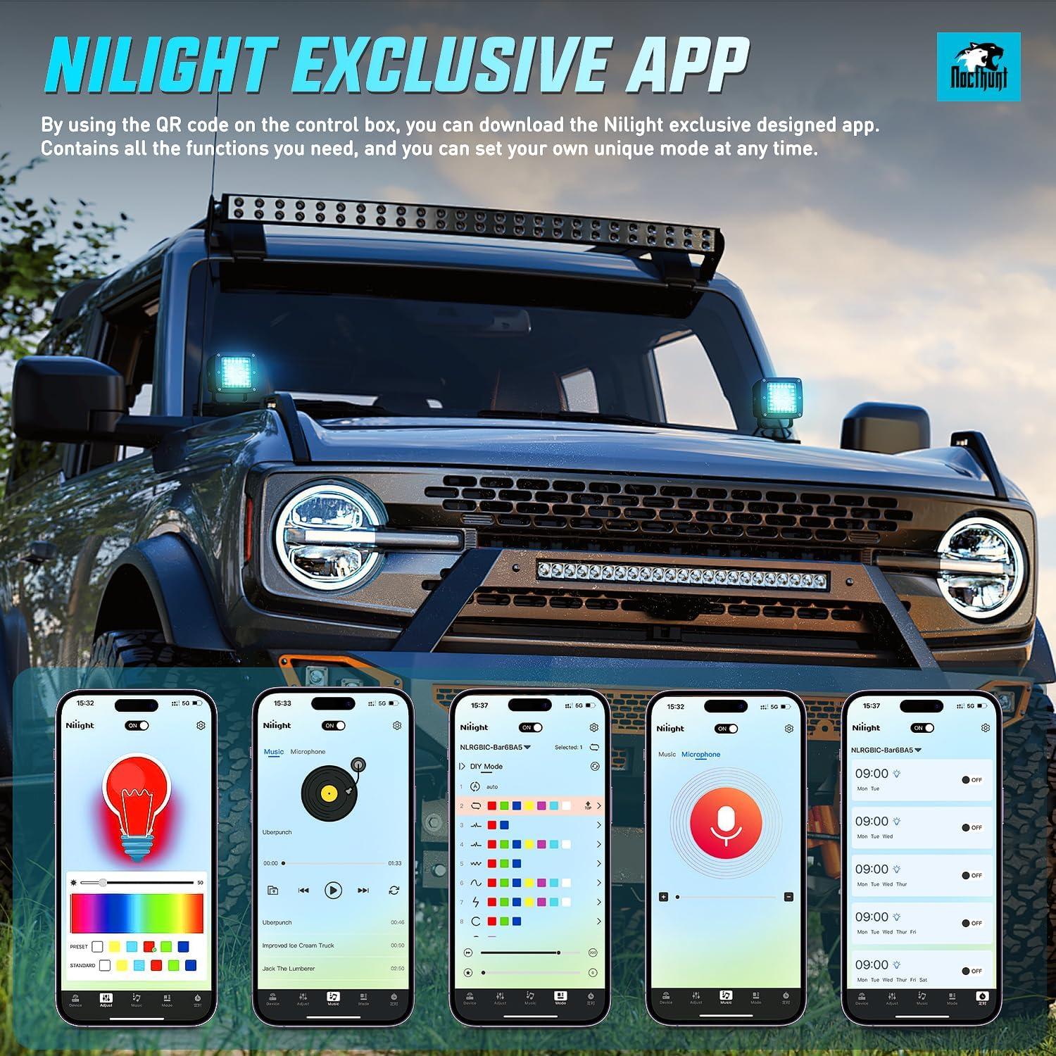RGB Halo Strip Modes: Through remote and Nilight's self-developed app, both light colors and fixed modes can be switched. In addition, the Nilight app can also customize modes, microphone synchronization, and music synchronization. The combination of different colors and modes brings the total number of modes to over 1000