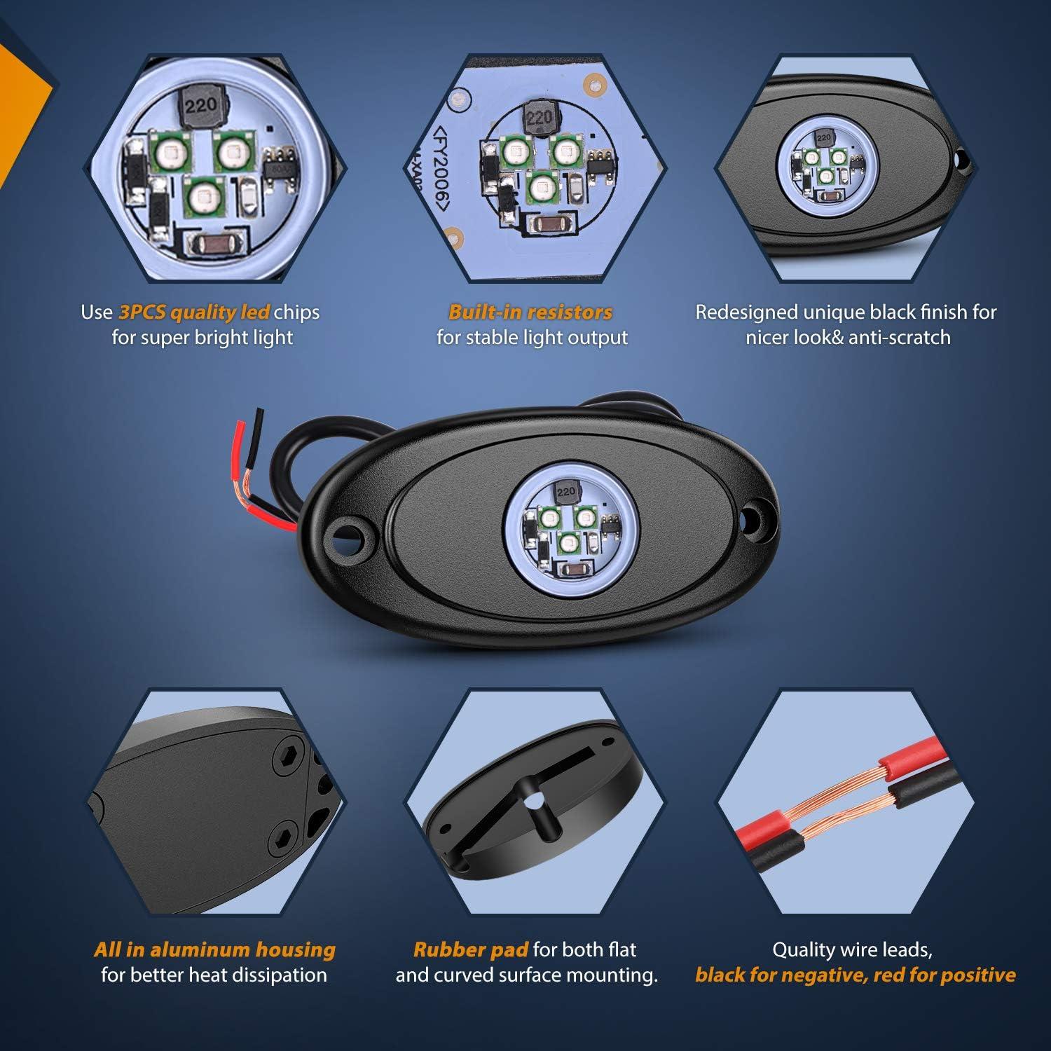Easy Installation: Get lights seated on rubber pads, with wires coming out from the side, and then mount light on the position with screws and nuts provided. Rubber pad works on both flat and curved surface