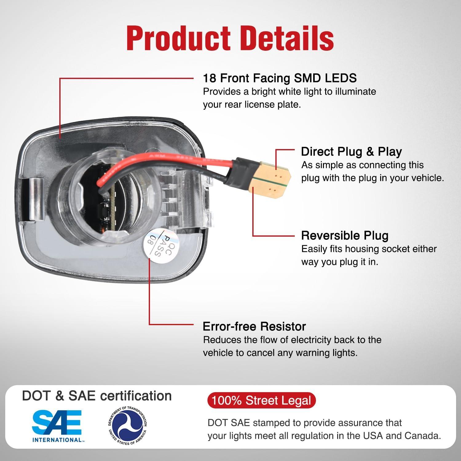 DOT Compliance: Our license plate lights are SAE and DOT certified to meet federal and international standards. Plug and play, OEM perfect fit, can be directly replaced without modification. Replaces Original (OE) Part number: 81270-35090, 81273-35130, 81270-35140, 81271-95J07, 81270-35120.