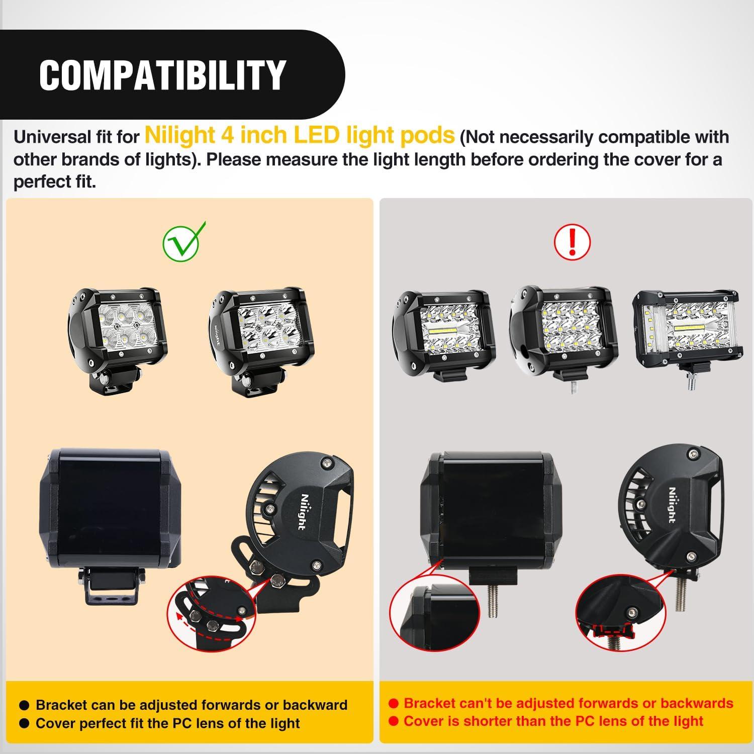 Wide application:Light covers compatible with Nilight 4″ 18W Double-Row LED light pods,light pods with different appearances may not be able to be installed.Please confirm the appearance and size of the light before purchasing