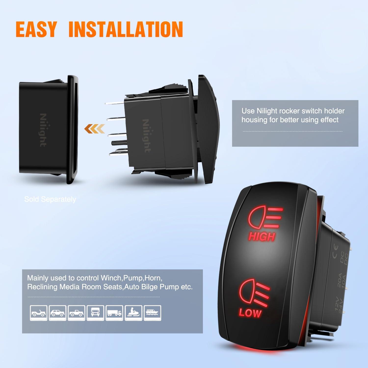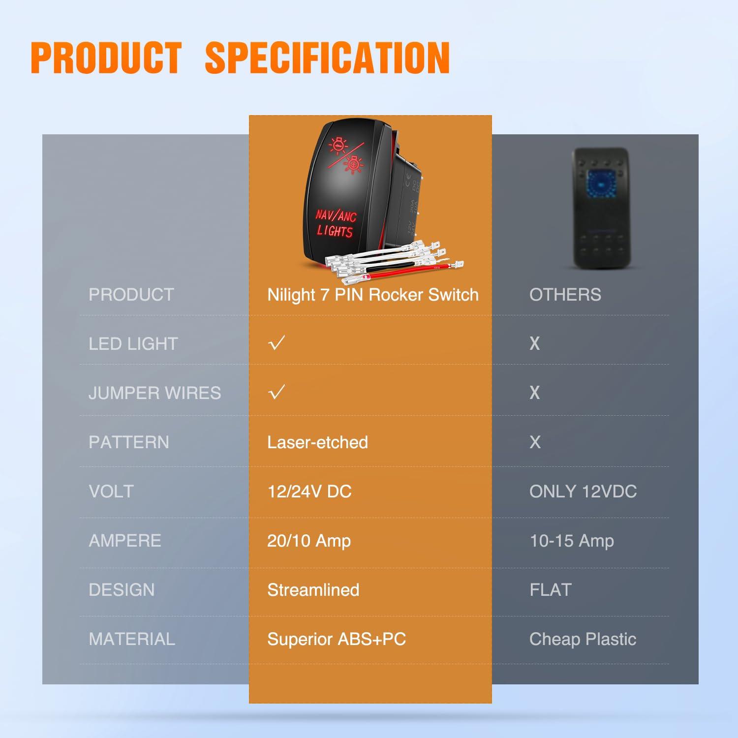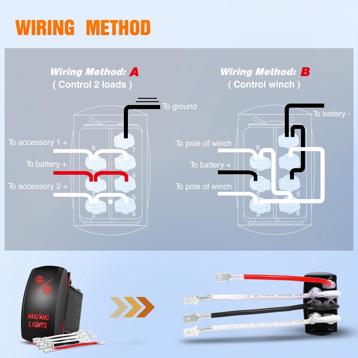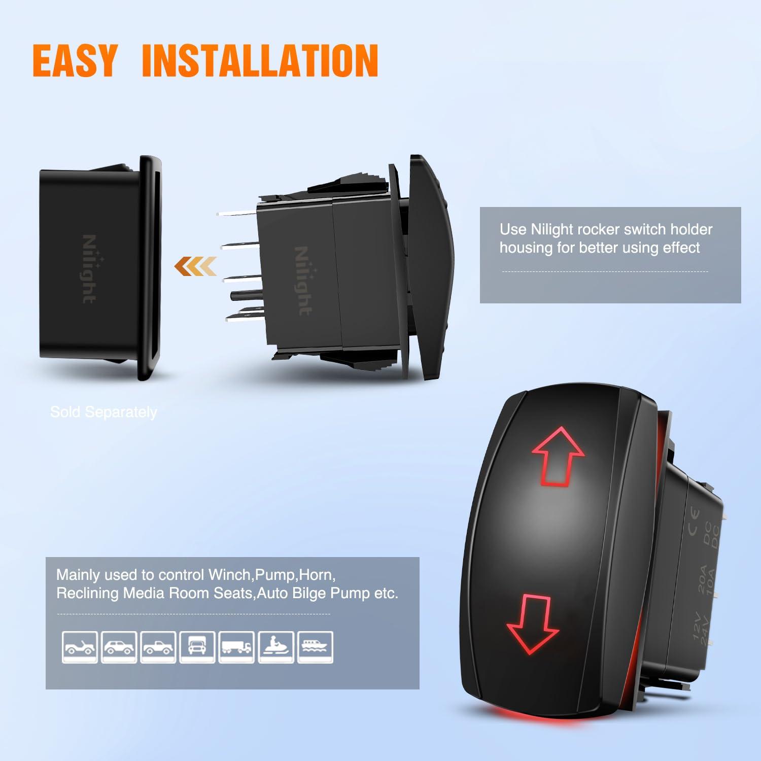 Easy to install and use: 7 pin on off on rocker switch with DPDT design (double pole double Throw), rated at 20AMP/12VDC and 10AMP/24VDC. Can be installed or replaced on the original rocker switch panels. It is easy and simple to set up. Can control 2 loads