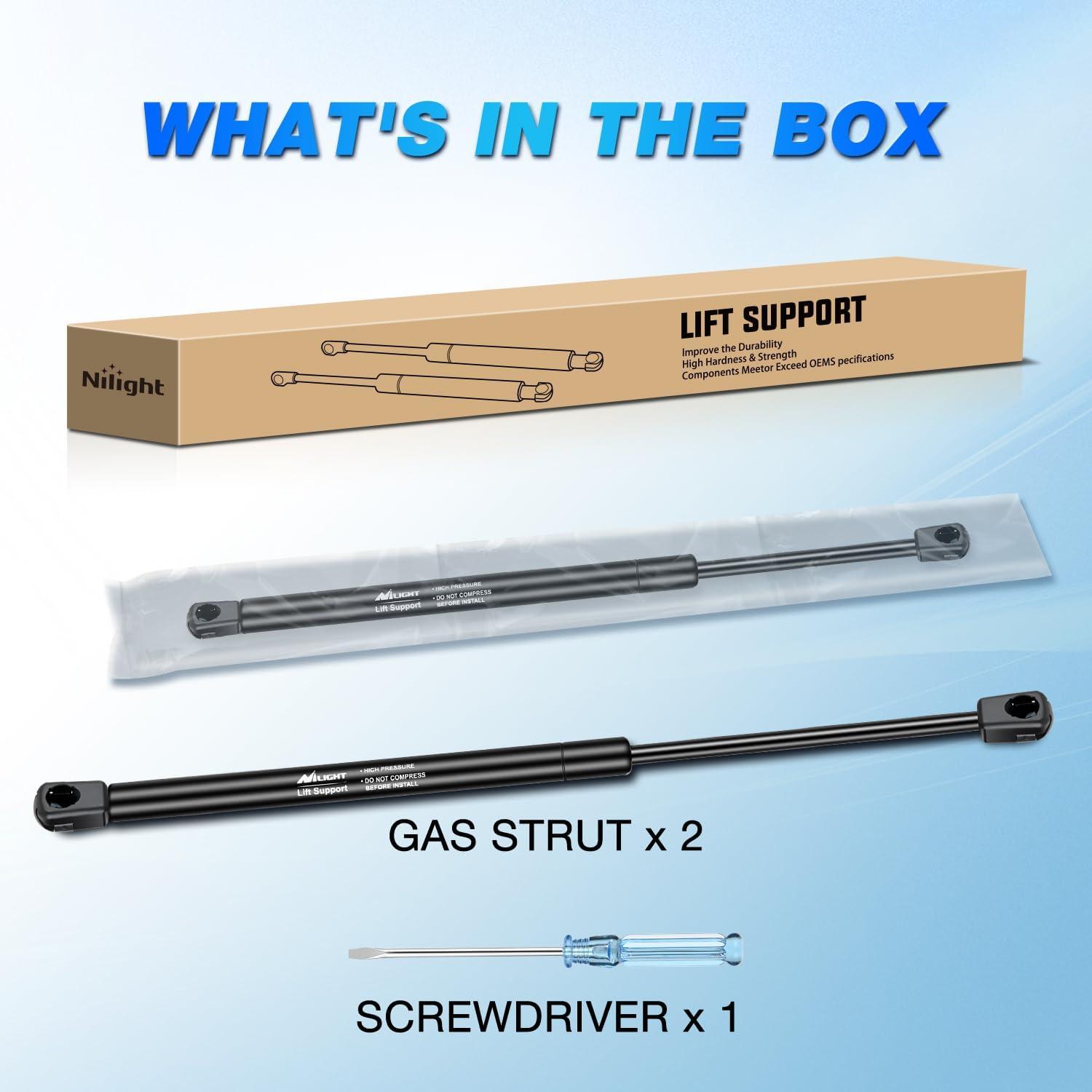 5 Minutes Installation: Nilight lift gate support struts are easy to install, no experience is required, a small flat-blade screwdriver allows you to complete the replacement installation within a few minutes, we provide a screwdriver with the order, you do not need to find another tool.