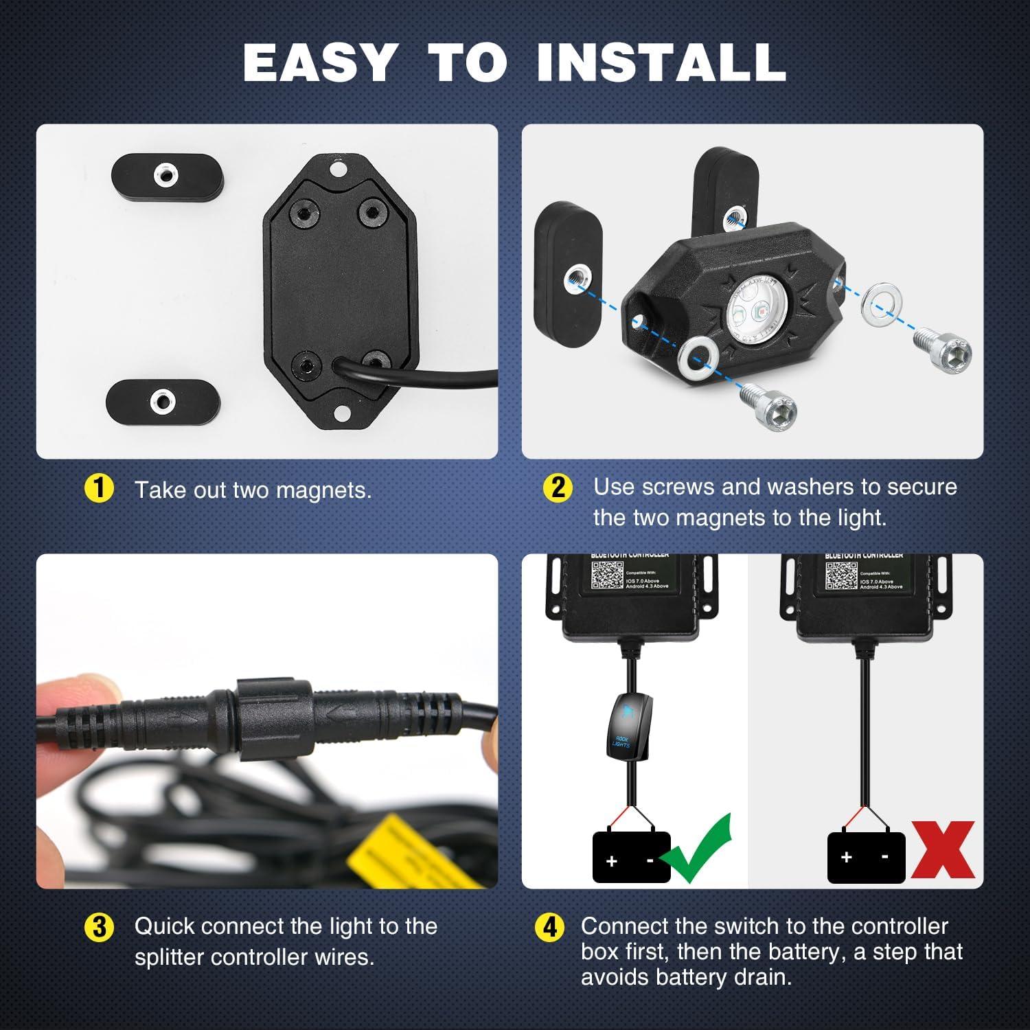 Easy installation: attach the magnetic base to the light, allowing you to magnetically attach the light to any desired location; then plug the light into the splitter controller cable and secure the controller box in a location that won't overheat; finally, connect the controller box to the power supply. (Note: Please connect to a switch first, not directly to the battery, to avoid draining the battery)