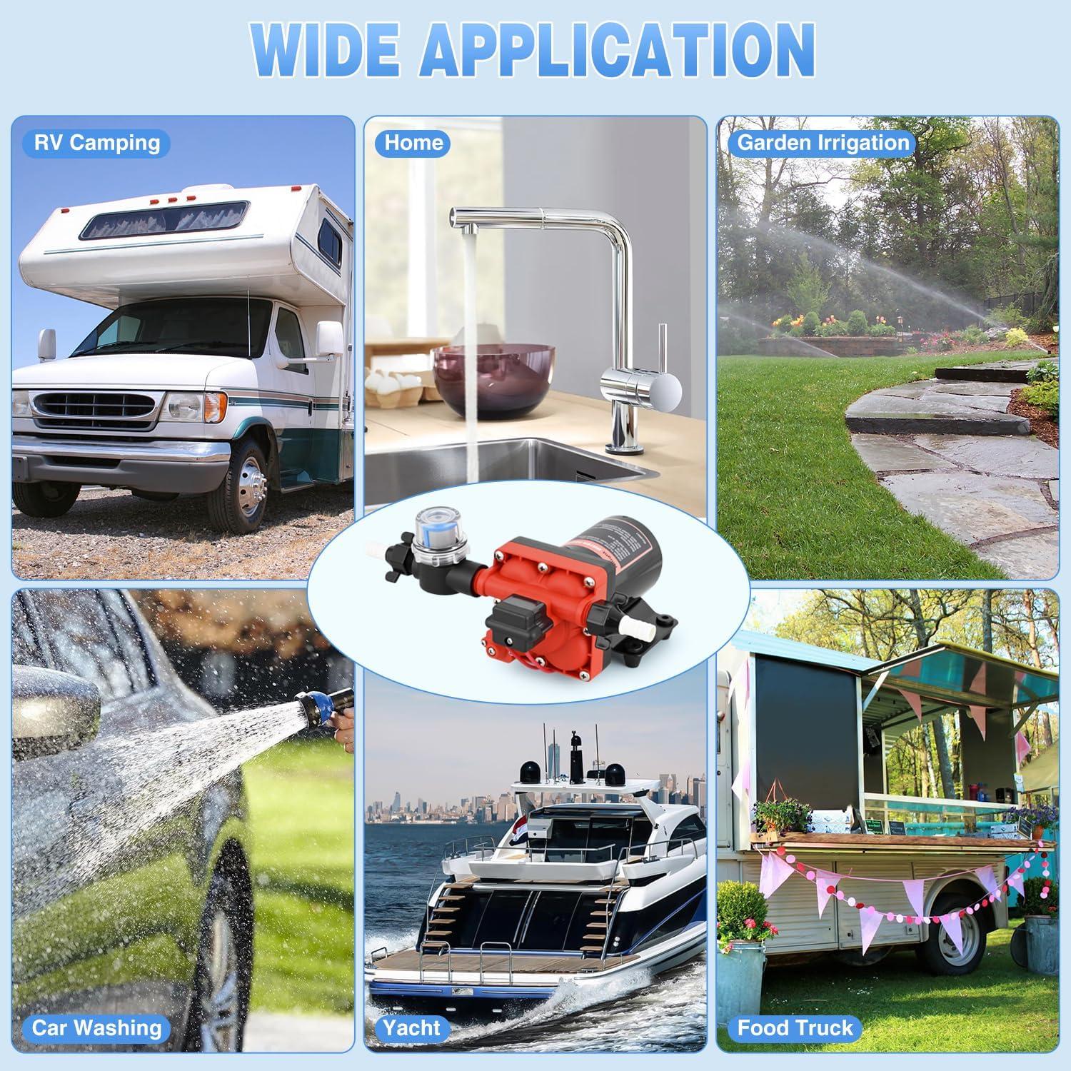 COMPATIBILITY & WIDELY USED: Featuring 1/2″ NPT inlet/outlet threads (compatible with standard hoses via included adapters), this RV diaphragm pump 12v excels in RV camping, yacht plumbing, home water systems, garden irrigation, car washing and food truck setups. From outdoor adventures to domestic use, it adapts seamlessly to any 12V-powered water supply need