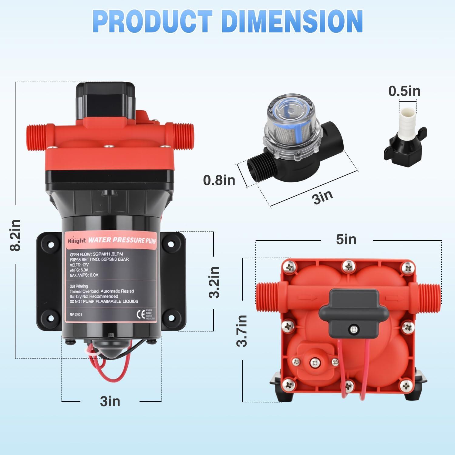 Nilight RV Water Pump 12v Camper Water Pump 5.5 GPM 70 PSI with Pressure Switch& Strainer Heavy Duty Diaphragm Pump 12 Volt DC Upgrade Self-Priming Low Noice for RV Camper Marine Yacht Caravan Trailer(3.0 GPM Water Pump)