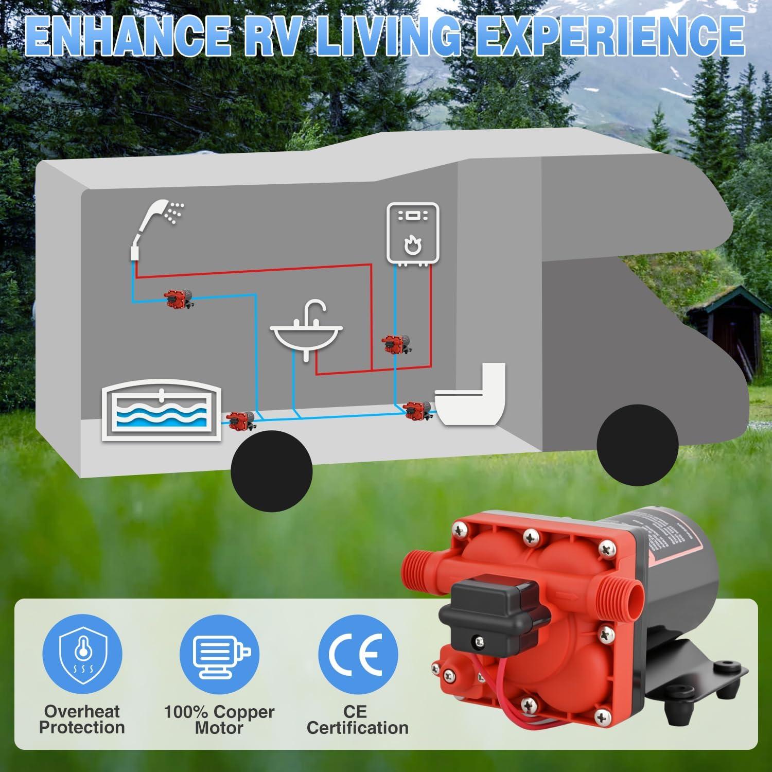 SAFE, QUIET & LONG-LASTING: The camper water pump equipped with thermal overload protection that auto-shuts off the pump to prevent overheating, extending its lifespan. The anti-slip rubber base and low-vibration design keep operation nearly silent, so even nighttime water use won’t disrupt your RV’s peaceful