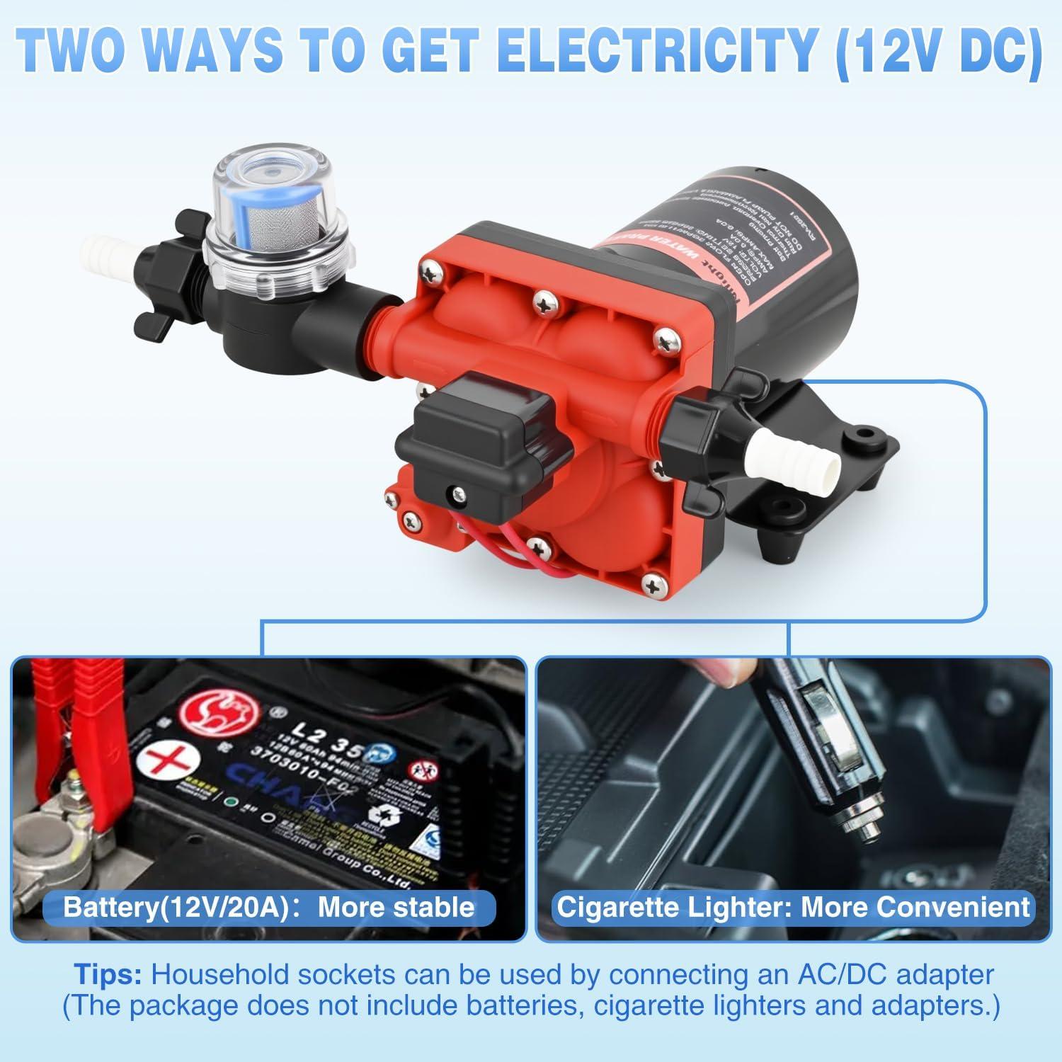 DURABLE MOTOR & RIGOROUS TEST: This 12 volt water pump Built with a full-copper motor and polypropylene housing for corrosion resistance and long life. The self-priming function supports vertical lift up to 9.8 feet (no manual priming required). Every water pump for rv undergoes factory testing—slight water residue inside is normal, please feel free to use it