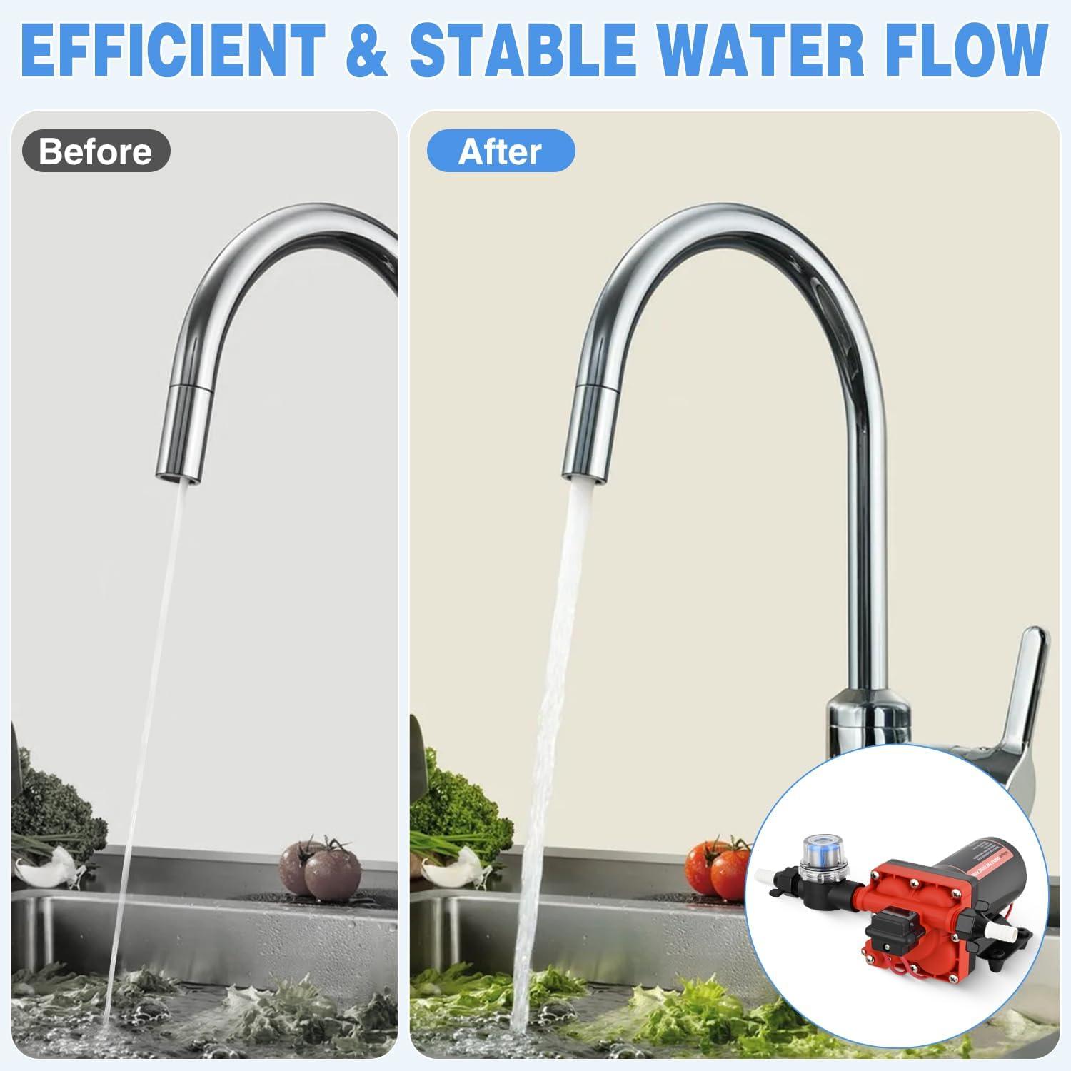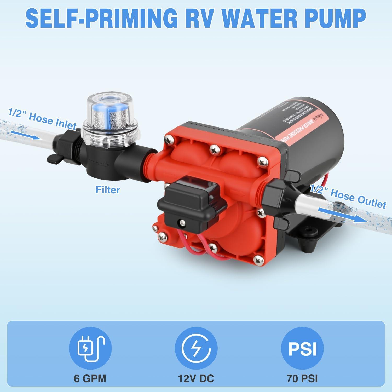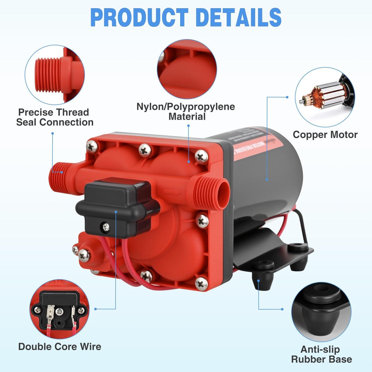 DURABLE MOTOR & RIGOROUS TEST: This 12 volt water pump Built with a full-copper motor and polypropylene housing for corrosion resistance and long life. The self-priming function supports vertical lift up to 9.8 feet (no manual priming required). Every water pump for rv undergoes factory testing—slight water residue inside is normal, please feel free to use it