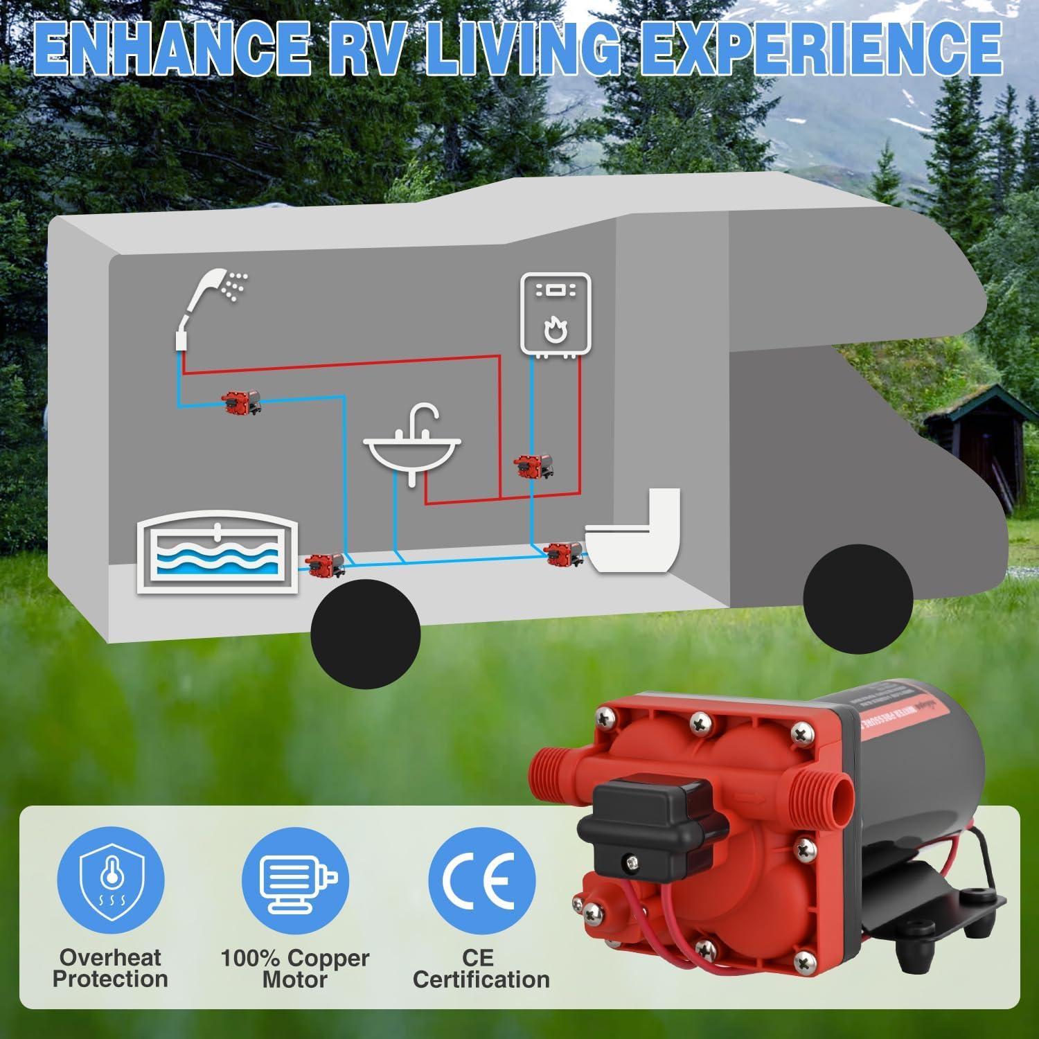 SAFE, QUIET & LONG-LASTING: The camper water pump equipped with thermal overload protection that auto-shuts off the pump to prevent overheating, extending its lifespan. The anti-slip rubber base and low-vibration design keep operation nearly silent, so even nighttime water use won’t disrupt your RV’s peaceful