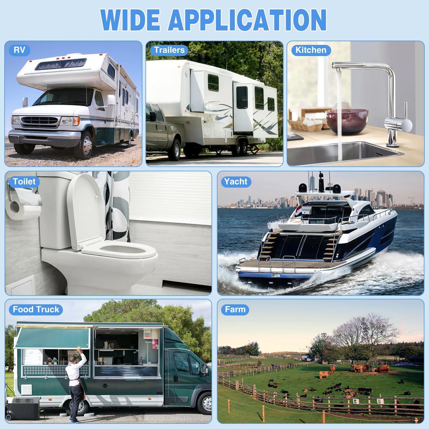 SAFE, QUIET & LONG-LASTING: The camper water pump equipped with thermal overload protection that auto-shuts off the pump to prevent overheating, extending its lifespan. The anti-slip rubber base and low-vibration design keep operation nearly silent, so even nighttime water use won’t disrupt your RV’s peaceful