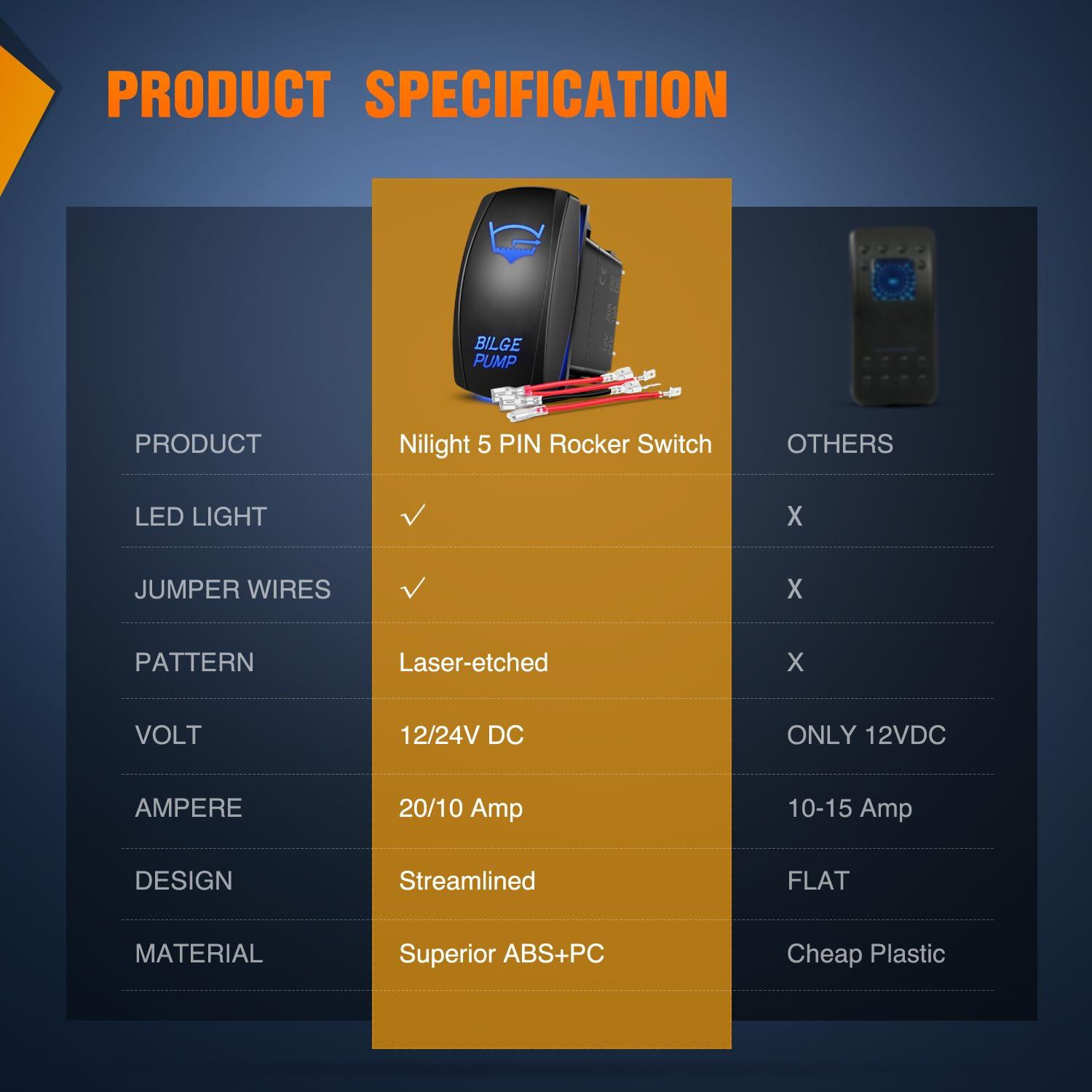 Easy to install and use: 5 pin on-off rocker switch with SPST design (single pole single Throw), simple installation, freely turn on or off the light.