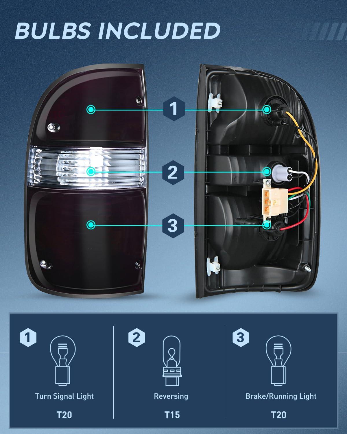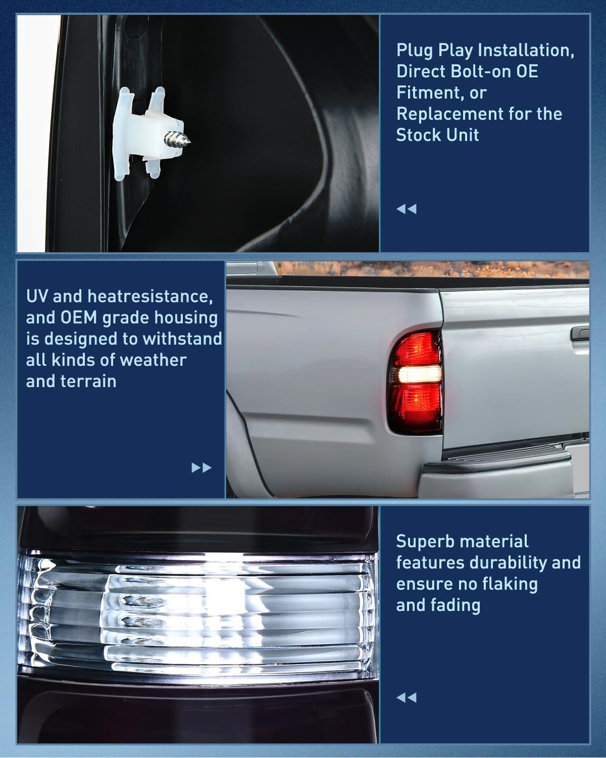 Compatibility: The taillight assemblies are compatible with 2001 2002 2003 2004 Toyota Tacoma. Please confirm the vehicle fitment before ordering.