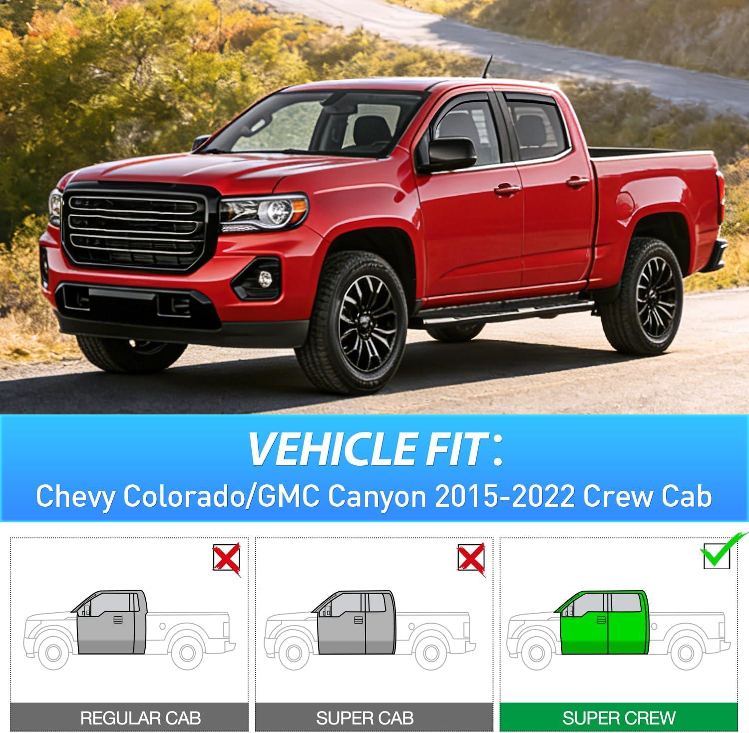 FITMENT: Side Window Deflectors specifically designed for Chevy Colorado GMC Canyon 2015–2022 Crew Cab ONLY. Please confirm your cab style before purchase