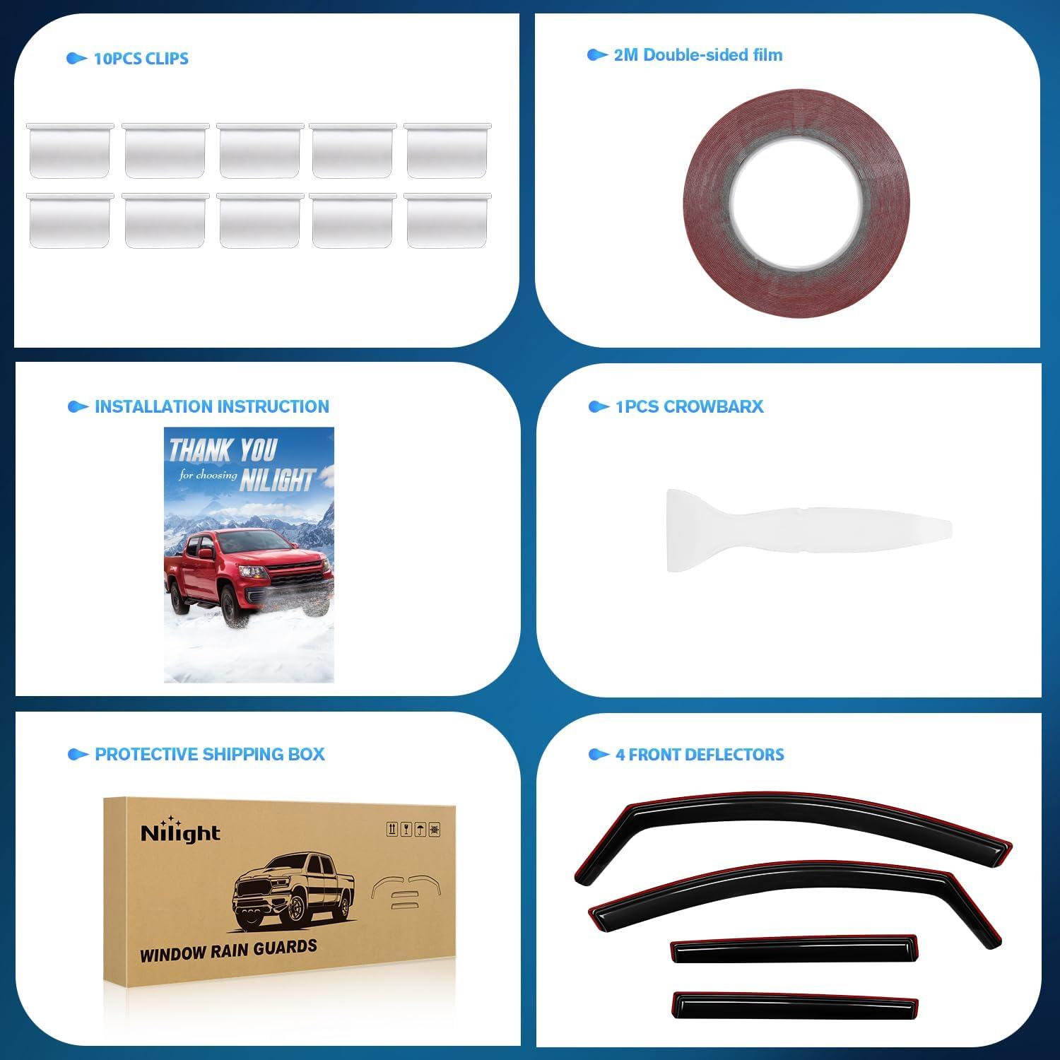 PACKAGE INCLUDED: 4PCS Window Rain Guards, 12PCS metal clips, 1 trim removal tool, automotive-grade double-sided tape, and step-by-step installation instructions. Clip-on mounting system ensures a secure and stable fit without drilling