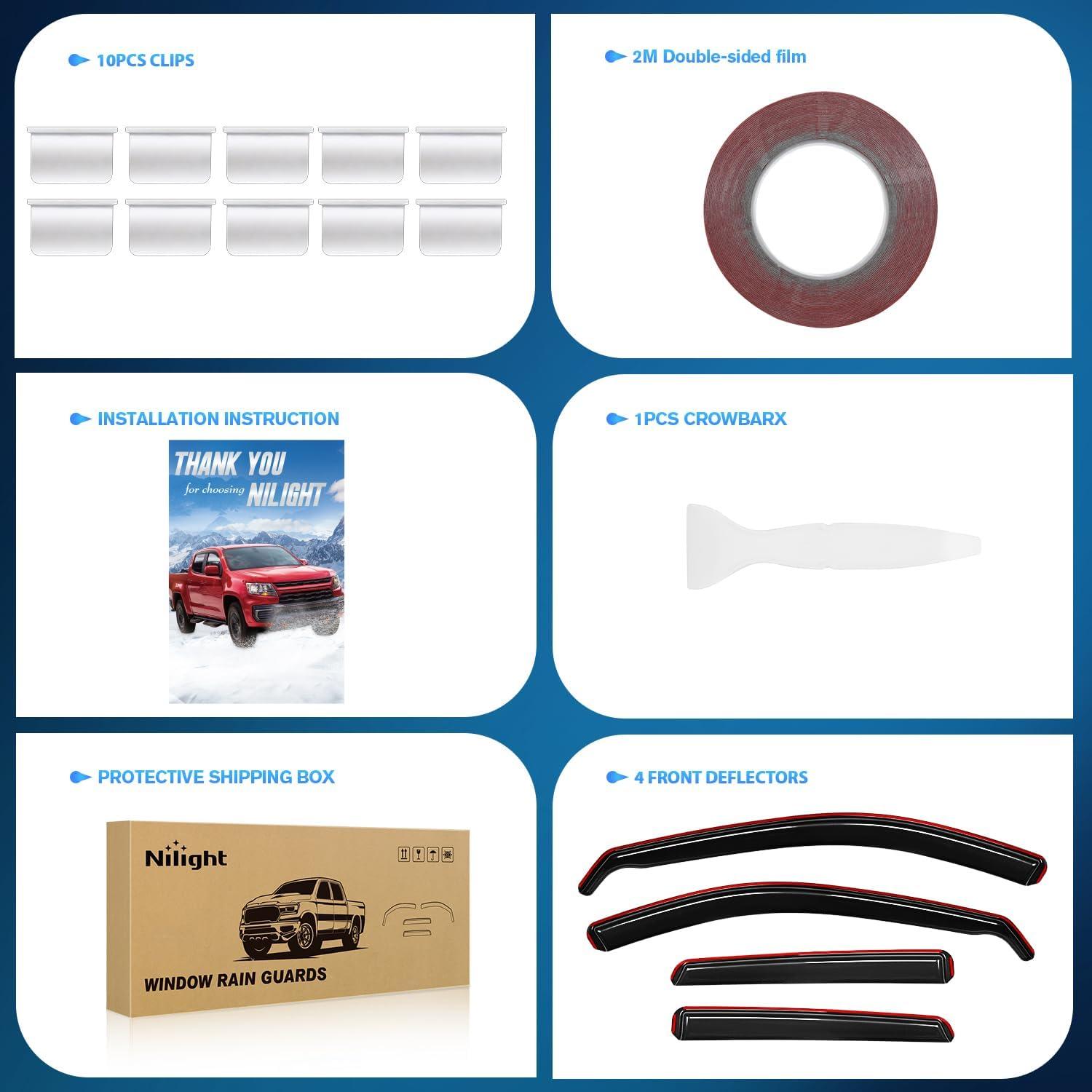 PACKAGE INCLUDED: 4PCS Window Rain Guards, 12PCS metal clips, 1 trim removal tool, automotive-grade double-sided tape, and step-by-step installation instructions. Clip-on mounting system ensures a secure and stable fit without drilling